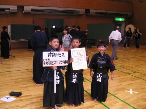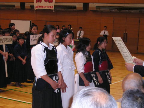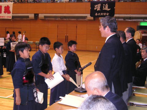 小学生低学年団体戦の表彰式。喜沢剣信会は2位でした。おめでとう!